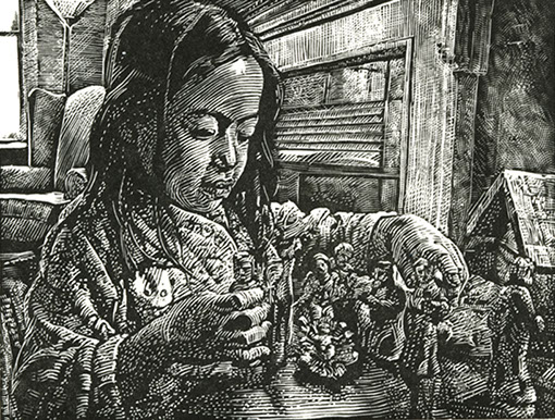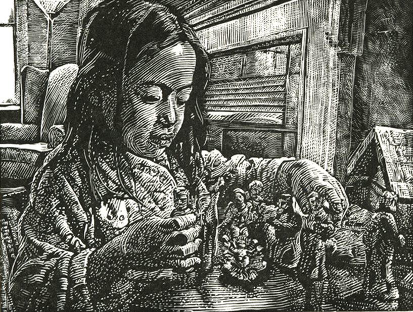 This wood-engraving print by Michael McGarvey “Child's Play” is limited to an edition of 84 signed and numbered prints, printed on White Gampi Paper.
