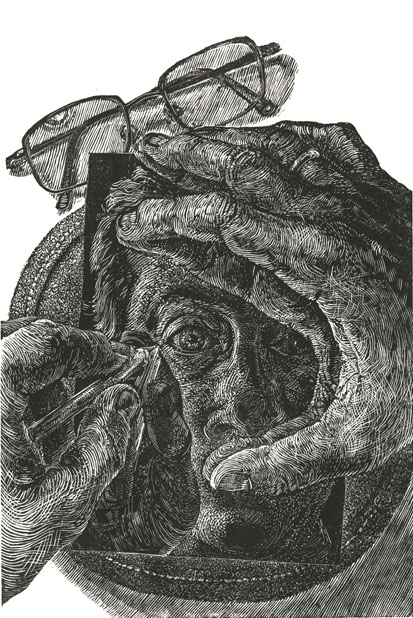 This wood-engraving print by Michael McGarvey “Me Myself and Eye ” is limited to an edition of 109 signed and numbered prints, printed on Zerkall Book Paper.