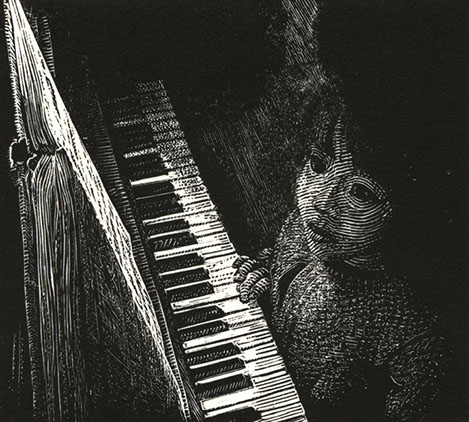 This wood-engraving print by Michael McGarvey “Music Book” is limited to an edition of 100 signed and numbered prints, printed on Zerkall Book Paper.