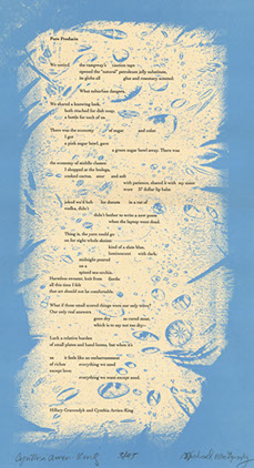 This broadside features "Pure Products" a collaborative poem written by Hillary Gravendyk and Cynthia Arrieu-King from the full poetry manuscript Unlikely Conditions (2016, 1913 Press). The numbered edition of 45 is signed by Cynthia Arrieu-King and graphic artist Michael McGarvey. It is printed using photo-polymer letterpress on Arturo paper.