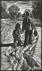 This wood-engraving print by Michael McGarvey “Snow Scene” is limited to an edition of 107 signed and numbered prints, printed on Mohawk Eggshell Paper.