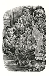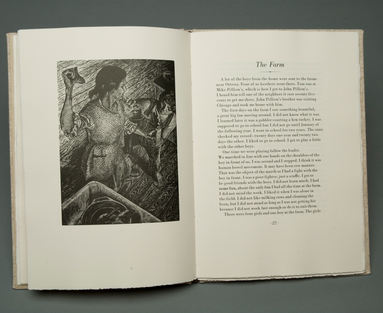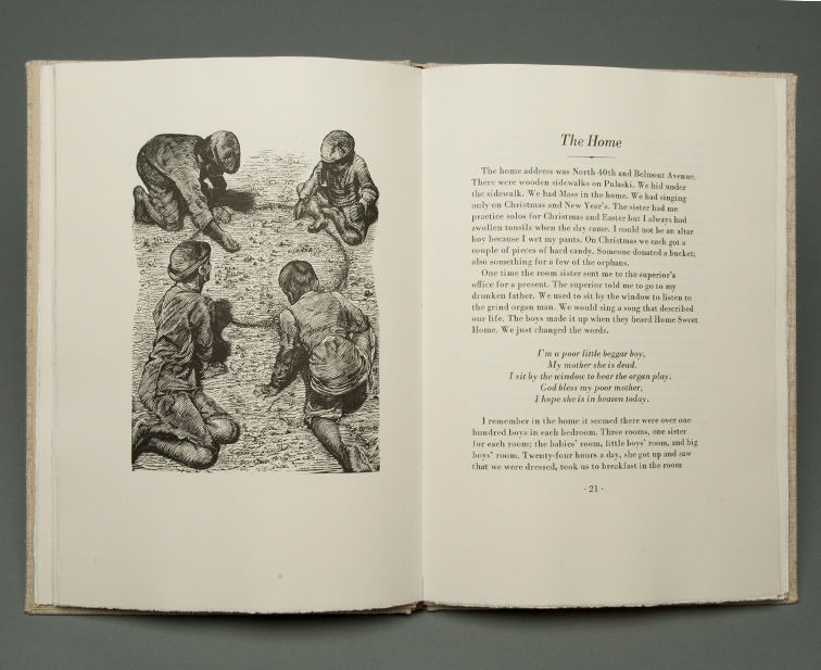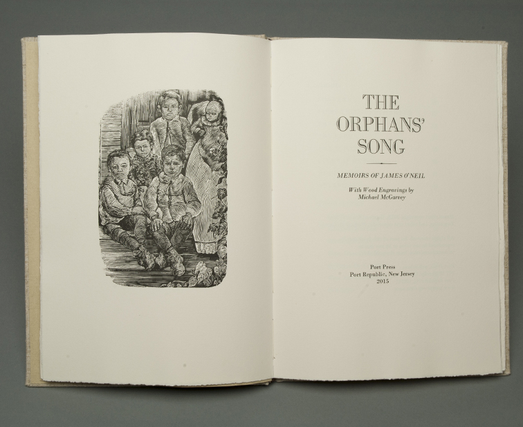 This edition of The Orphans' Song; Memoirs of James O'Neil with Wood Engravings by Michael McGarvey is limited to one hundred copies, numbered and signed by the artist. It was designed and printed at the Port Press, Port Republic, New Jersey. The type is hand-set Bodoni Semi- Bold cast by M&H Type. The paper is Zerkall Book, printed damp on a Hoe Washington iron handpress. The edition is hand-bound at the Cambell Logan Bindery Inc., Minnesota.