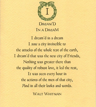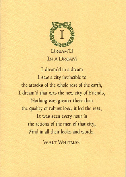 This two color letterpress card of Walt Whitman selection printed using ATF Fransciscan and Friar small caps. The idea came for this card came shortly after 9/11/01. These are limited to an edition of 206 signed and numbered prints. It is printed using on Arturo Butter-cream Paper in brown and green.